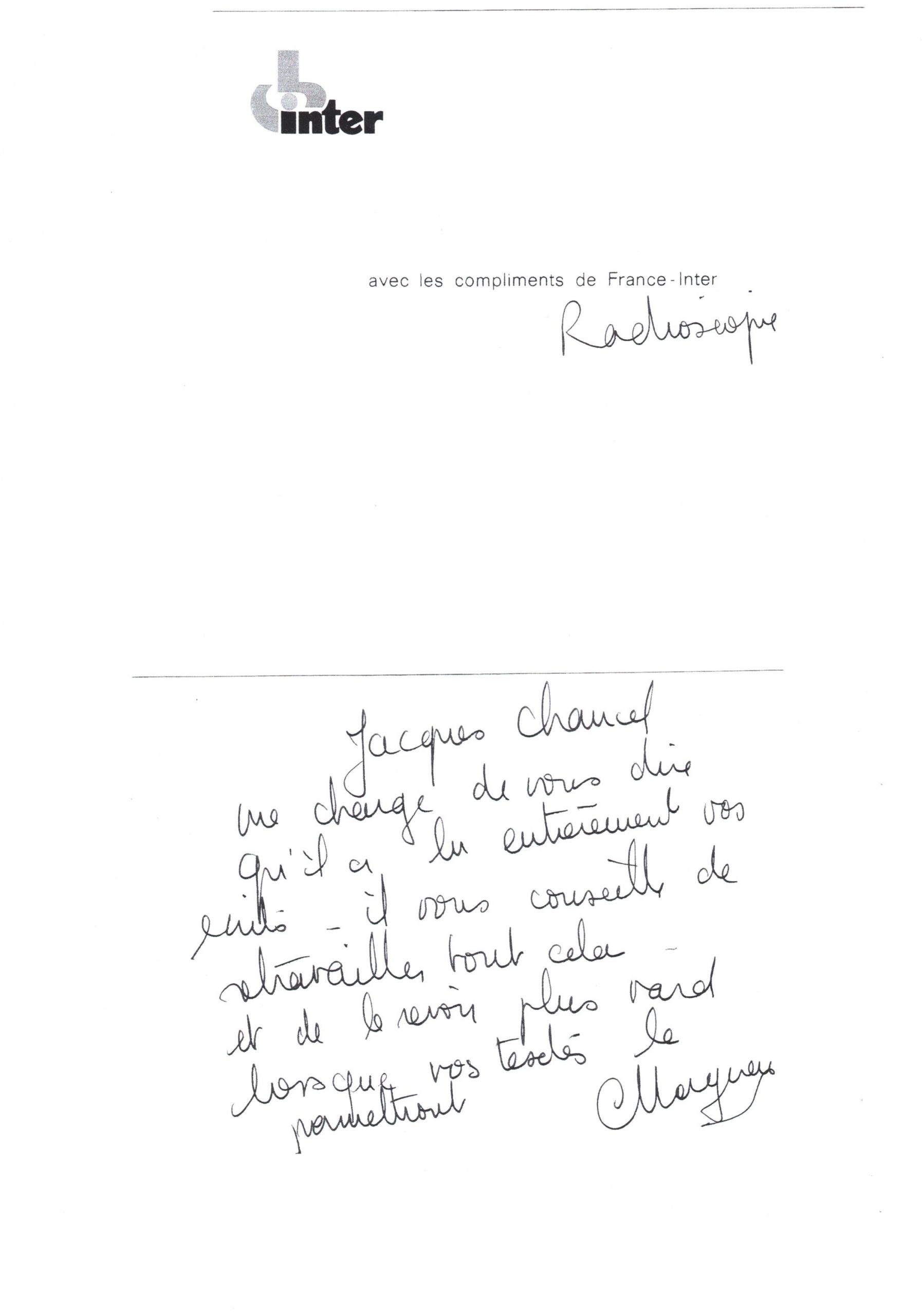 Jacques Chancel est là, sans doute, mais glacial, méconnaissable ; son sourire s’est tari. Il me lâche, péremptoire : « Voyez avec ma secrétaire ! » Il me fait dire ! La secrétaire me remet une carte « Avec les compliments de France-Inter, Radioscopie ». Drôle de compliments* :