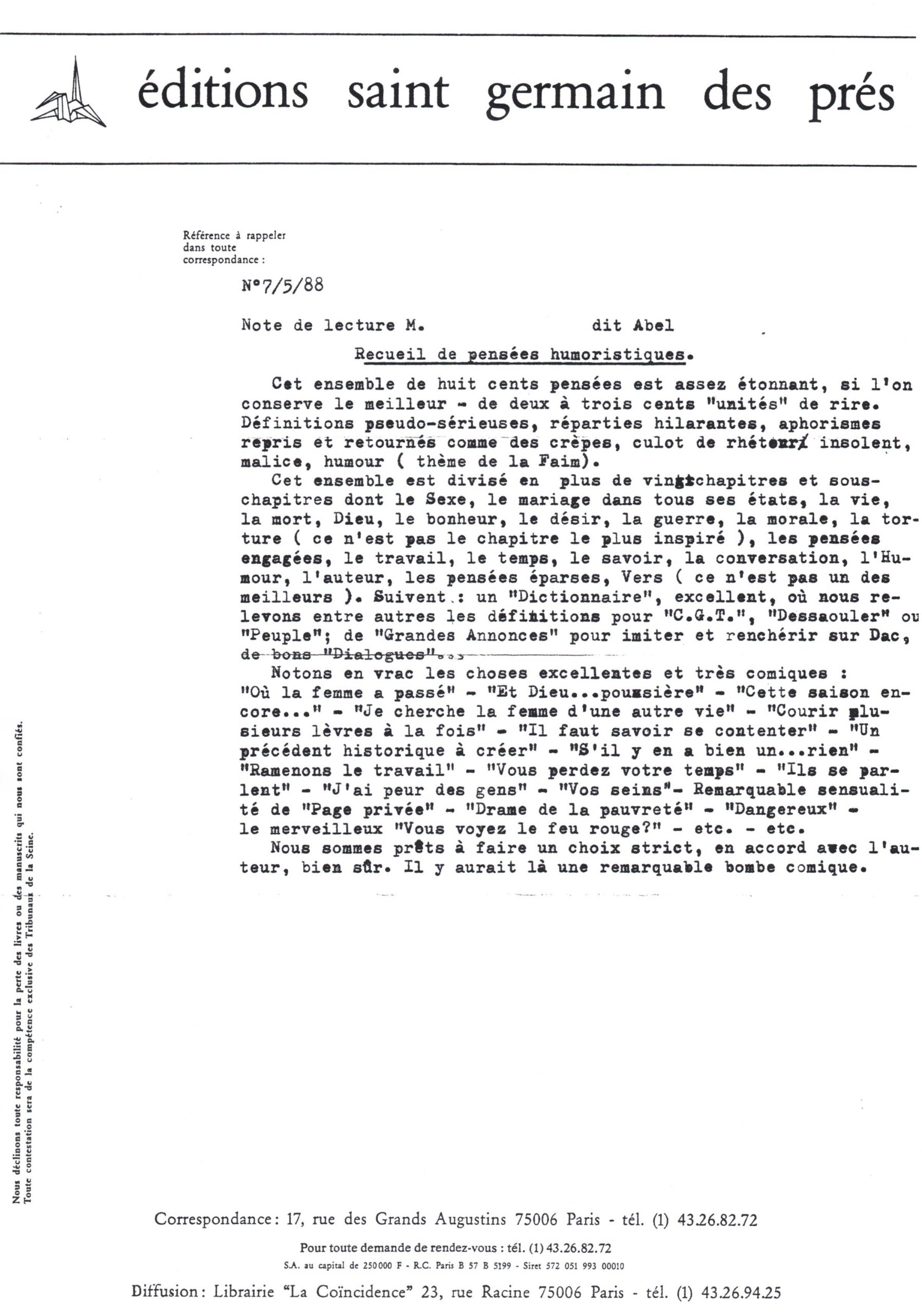 L’auteur achève un recueil de 900 Pensées humoristiques qu’il adresse au Cherche midi (éditeur de comiques estampillés dans la collection « Les Pensées »), et que le comité de lecture n’hésitera pas à qualifier de « remarquable bombe comique ».